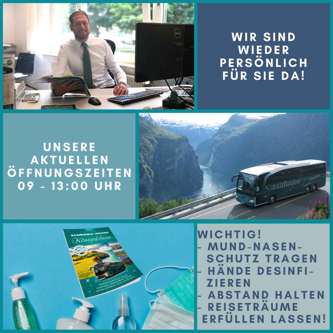 Für Buchungen und Nachfragen nutzen Sie gern unsere Homepage, Kontaktformulare oder die E-Mail Adresse info@schoernig-reisen.de. Bitte verstehen Sie, dass die Bearbeitung mehr Zeit in Anspruch nehmen kann als sonst.